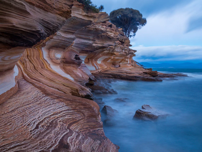 What these cliffs lack in height they more than make up for with their amazing colours and swirling patterns. The patterns are caused by ground water percolating down through the sandstone and staining the rock. Wave action and sea spray have continued the erosion, resulting in magical honeycomb patterns, potholes and notches.